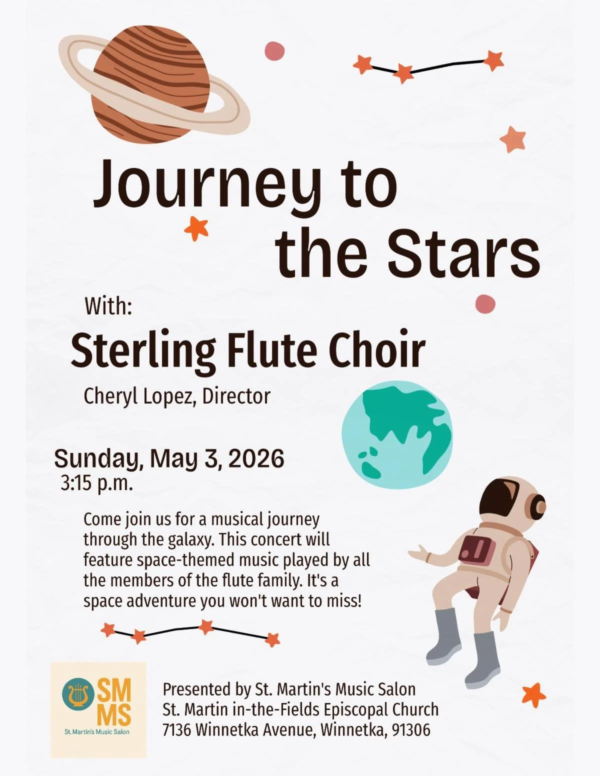 Journey To The Stars with the Sterling Flute Choir Sunday, May 3, 2026 3:15 PM 4:15 PM 15:15 16:15 St. Martin in-the-Fields, Winnetka 7136 Winnetka Ave Winnetka, CA 91306 USA (map) Google Calendar ICS